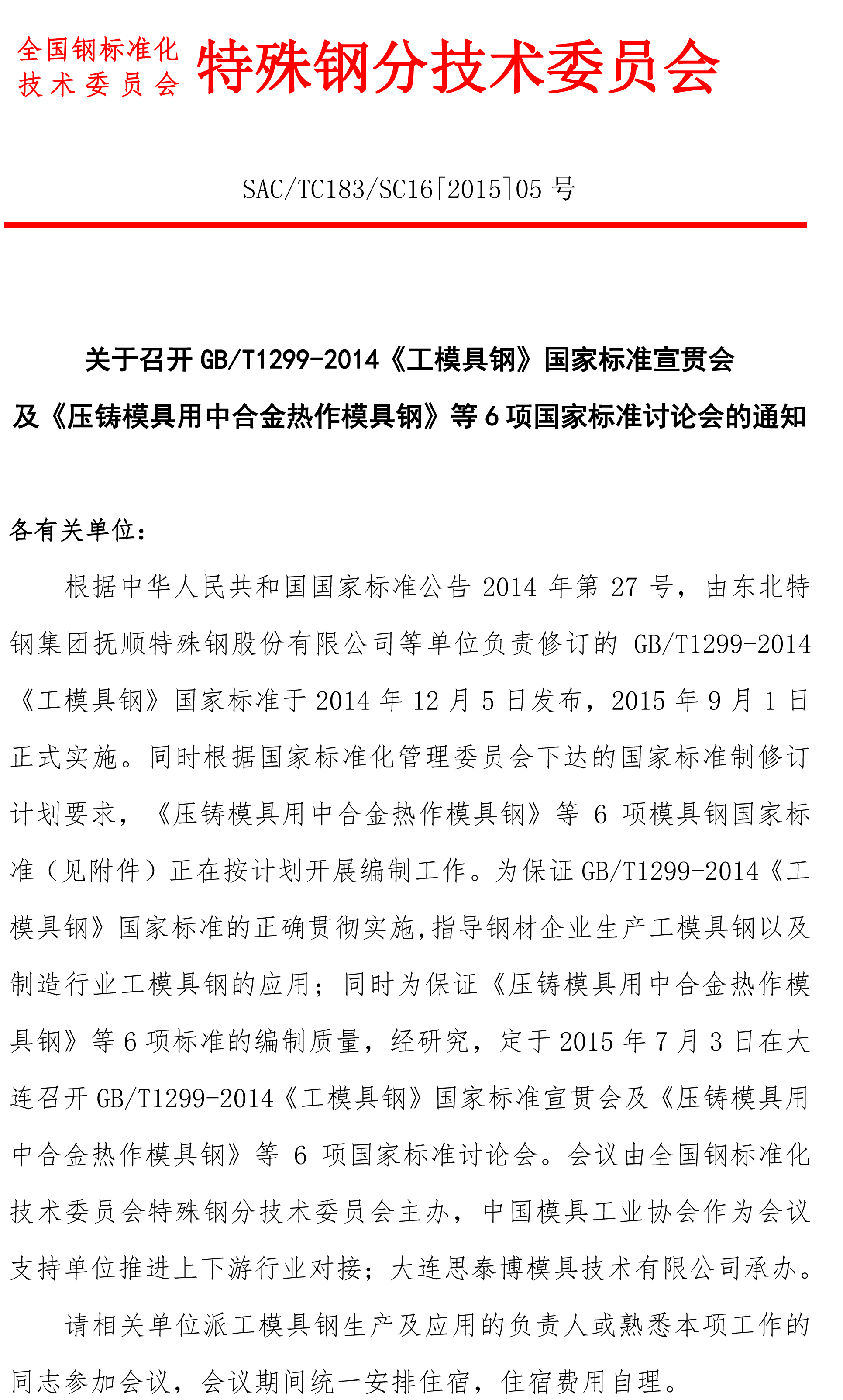 關于召開GB/T1299-2014《工模具鋼》國家標準宣貫會及《壓鑄模具用中合金熱作模具鋼》等6項國家標準討論會的通知