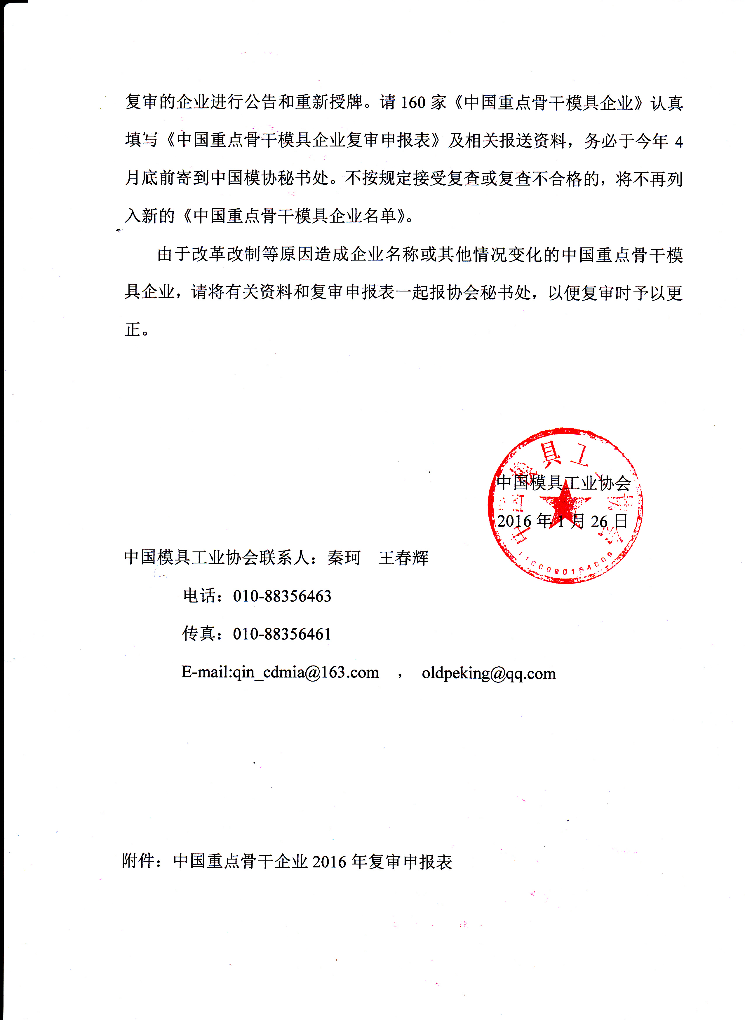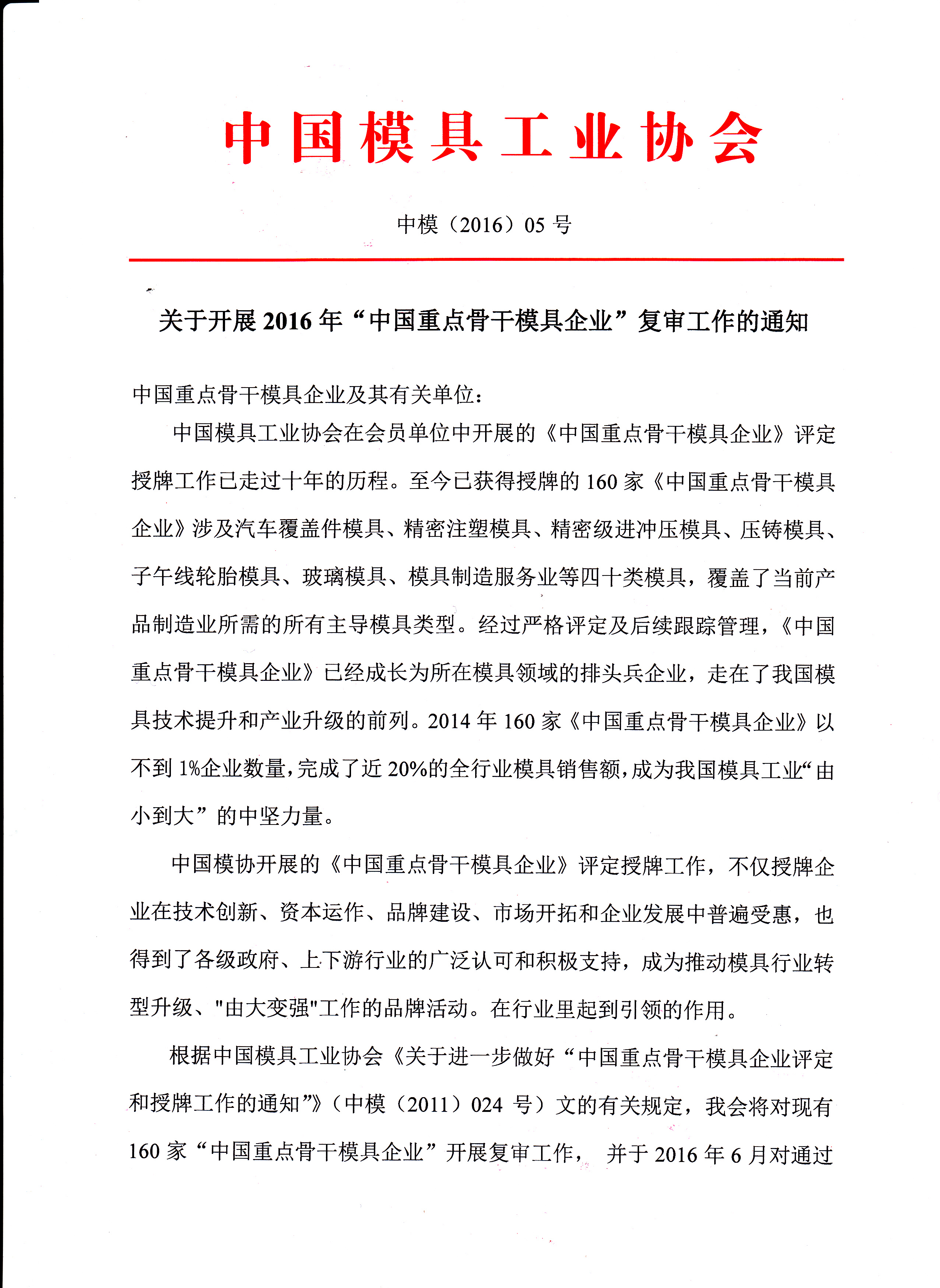 關于開展2016年“中國重點骨干模具企業”復審工作的通知