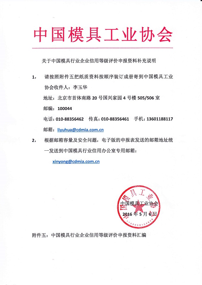 中國模具行業企業信用等級評價申報補充材料與說明