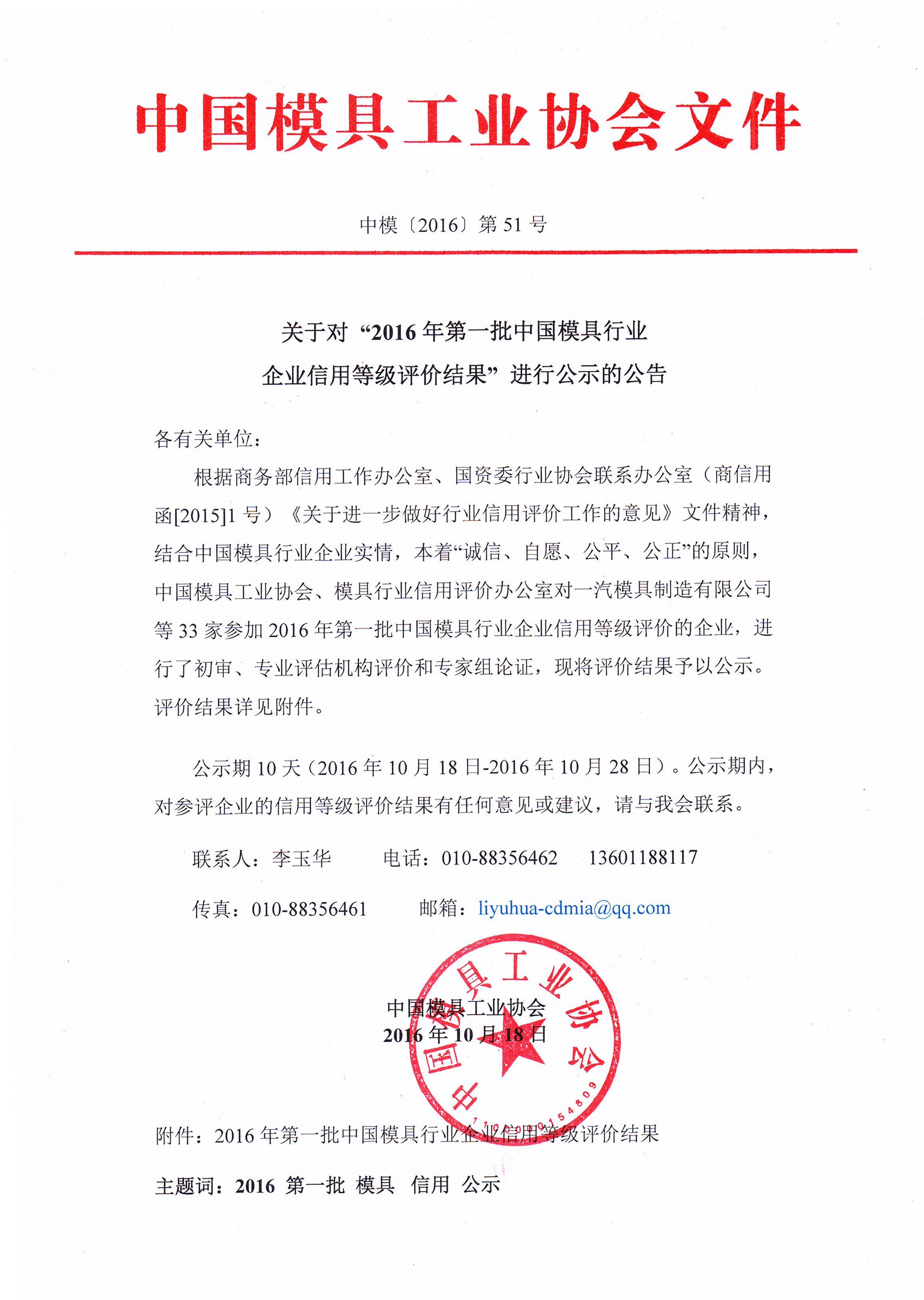 關于對“2016年第一批中國模具行業(yè)企業(yè)信用等級評價結果”進行公示的公告