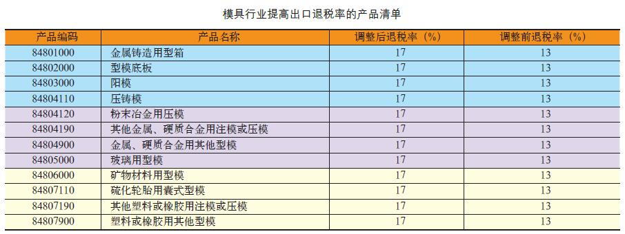 動(dòng)機(jī)、汽油、航空煤油、柴油等產(chǎn)品的出口退稅率提高至17%,并自2016 年11 月1 日起執(zhí)行。本通知所附《提高出口退稅率的產(chǎn)品清單》中,模具行業(yè)提高出口退稅率的產(chǎn)品清單具體如下表所示:
