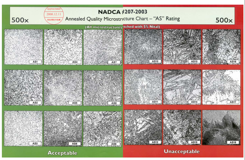 NADCA 207#-2003標(biāo)準(zhǔn)中進(jìn)行了修訂,劃分依據(jù)是偏析帶中是否存在可見(jiàn)的大顆粒一次碳化物,存在即判為不合格,并且不再區(qū)分不同鋼種的帶狀組織。如下圖: