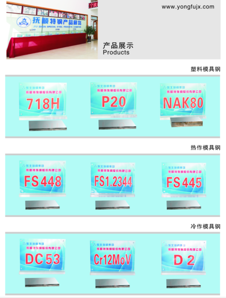 撫順特鋼以生產(chǎn)經(jīng)營高檔次、高附加值特殊鋼為主要業(yè)務,是國內(nèi)特殊鋼行業(yè)的龍頭企業(yè)。我司是撫順特殊鋼股份有限公司專營代理商,主要經(jīng)營撫順特鋼的塑料模具鋼(718H、P20、NAK80) 、熱作模具鋼(FS448、FS413、FS445) 、冷作模具鋼(DC53、Cr12MoV、D2)的批發(fā)兼零售;同時,我司擁有一支技術(shù)實力雄厚的隊伍為客戶提供優(yōu)質(zhì)的模具熱處理服務,并獲得撫順特鋼認證。