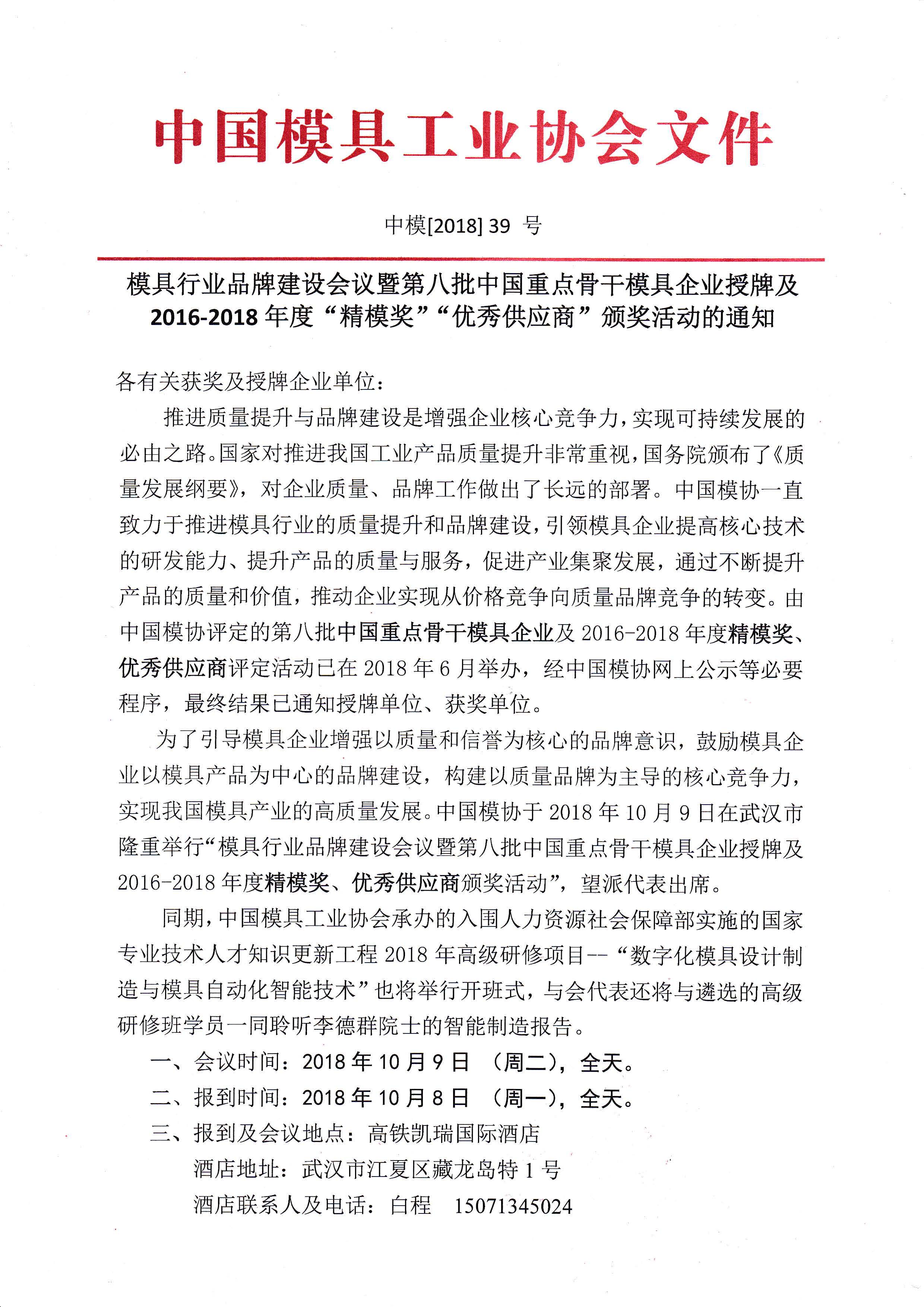 第八批中國重點骨干模具企業授牌及2016—2018年度“精模獎”“優秀供應商”頒獎