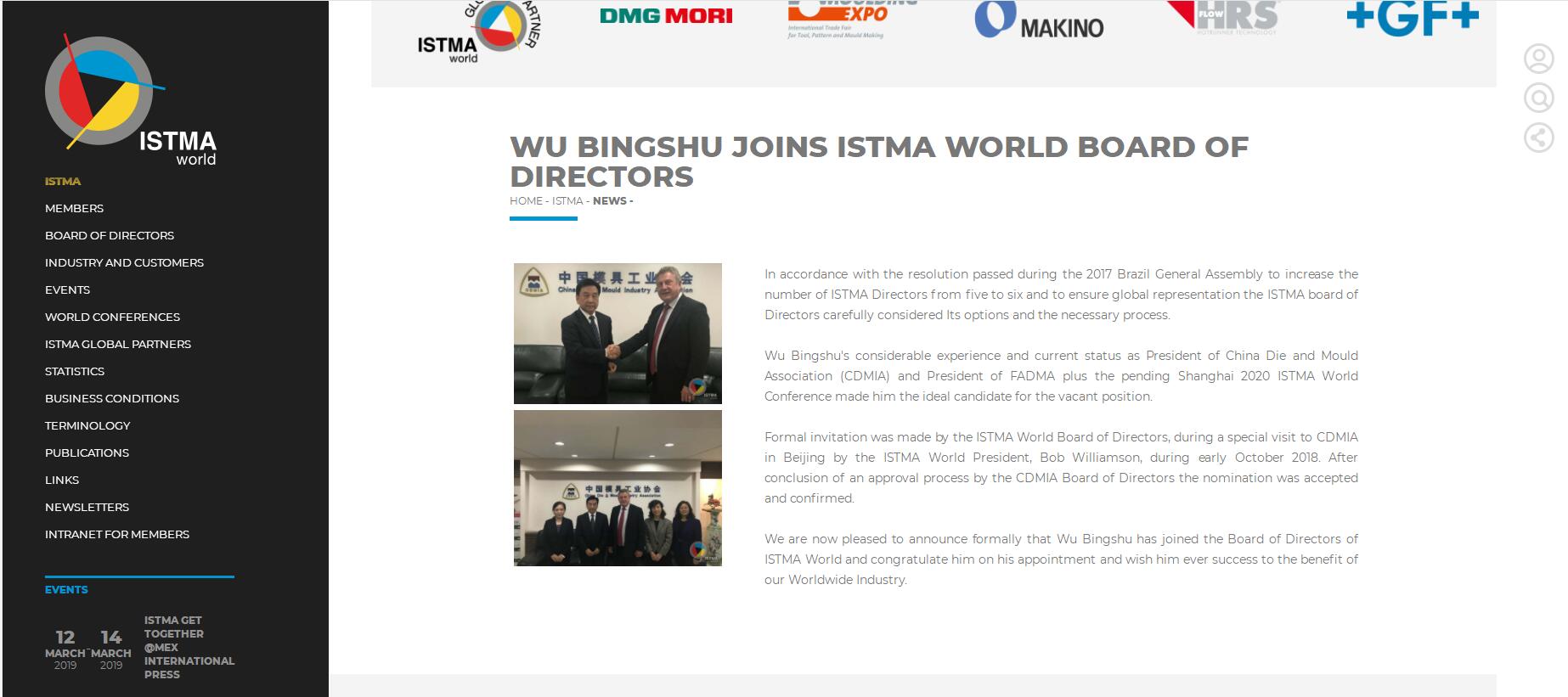 國(guó)際專(zhuān)用工裝和加工協(xié)會(huì)主席Bob Williamson于2018年 9月18日郵件正式致函中國(guó)模具工業(yè)協(xié)會(huì),經(jīng)他提名中國(guó)模具工業(yè)協(xié)會(huì)會(huì)長(zhǎng)武兵書(shū)先生擔(dān)任國(guó)際模協(xié)ISTMA董事(ISTMA World Director)。
