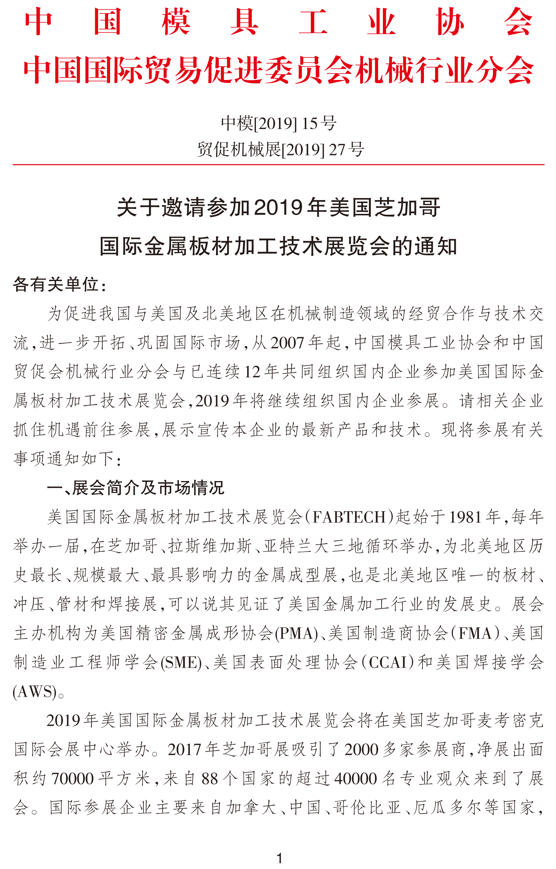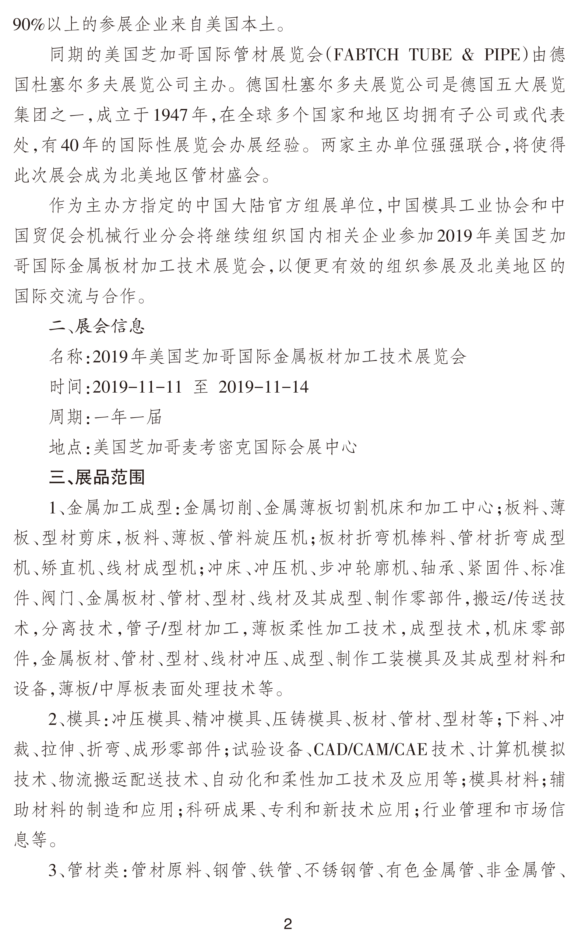 關于邀請參加2019年美國芝加哥國際金屬板材加工技術展覽會的通知