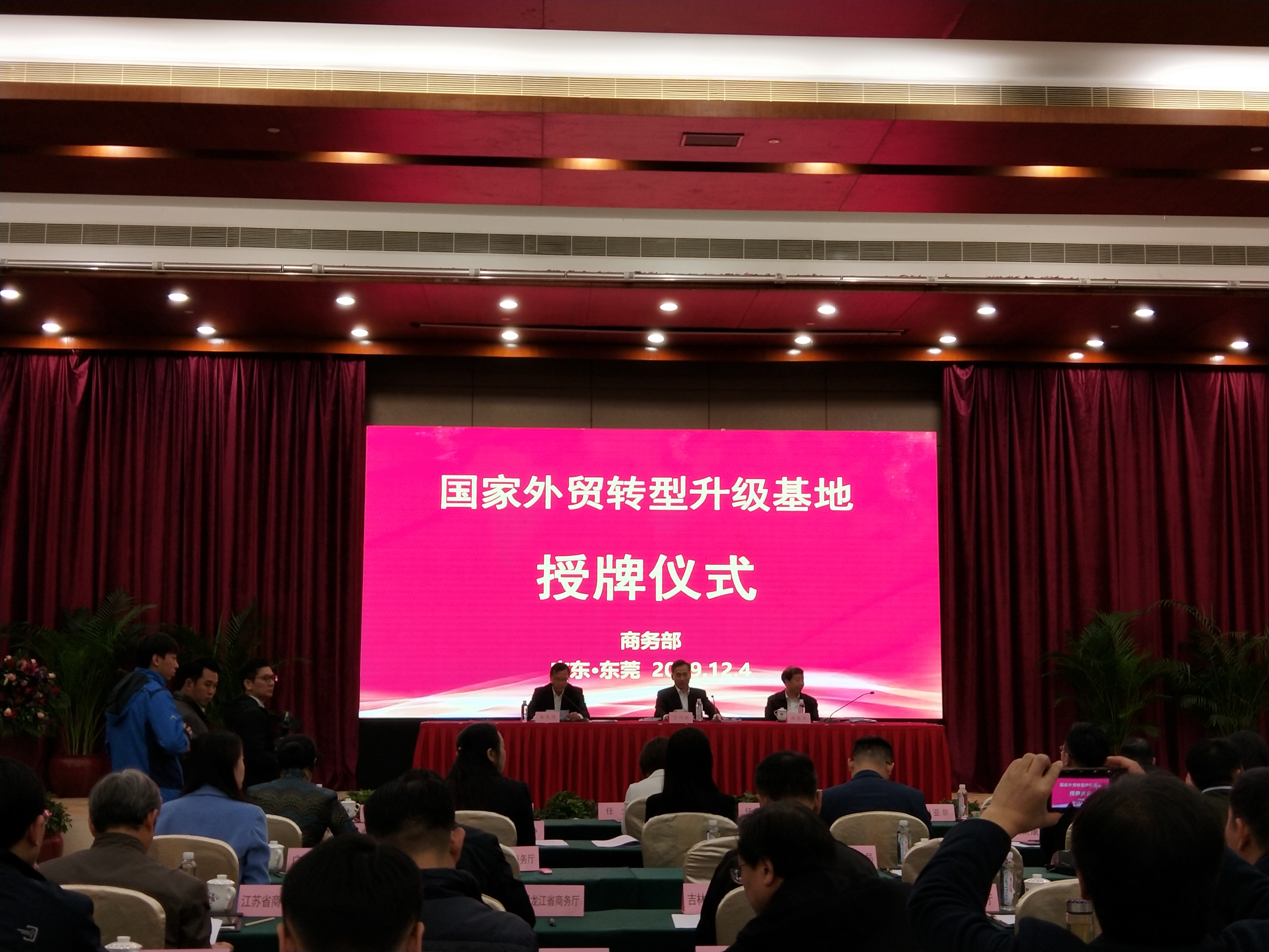 12月4日,商務部國家外貿轉型升級基地授牌儀式在東莞舉行,商務部部長助理任鴻斌為2019 年認定的65 個國家外貿轉型升級基地授牌,并在國家外貿轉型升級基地建設培訓班做了《堅持新發展理念,加快外貿轉型升級基地建設推進貿易高質量發展》的專題講座。商務部外貿司副司長宋先茂、商務部駐廣州副特派員謝瑩、廣東省商務廳副廳長任少、東莞市市長肖亞非、商務部國際商報社副社長史柳石,以及全國各省市商務廳(委、局)與65家基地負責人出席了授牌儀式。