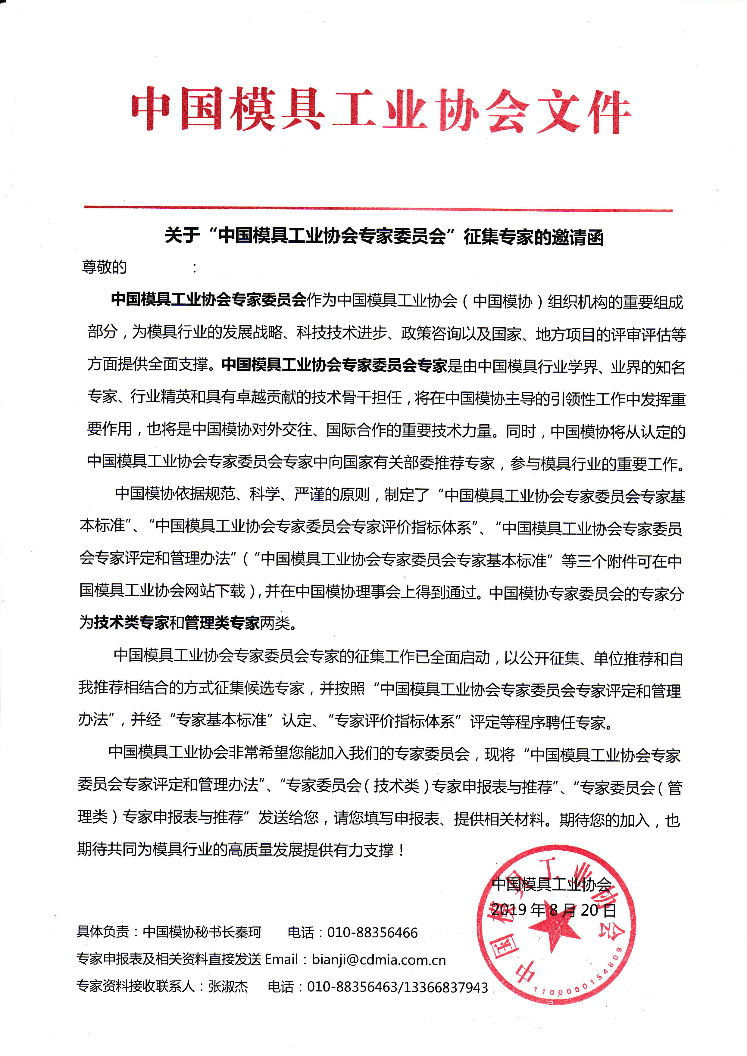 關(guān)于“中國模具工業(yè)協(xié)會專家委員會”征集專家的邀請函
