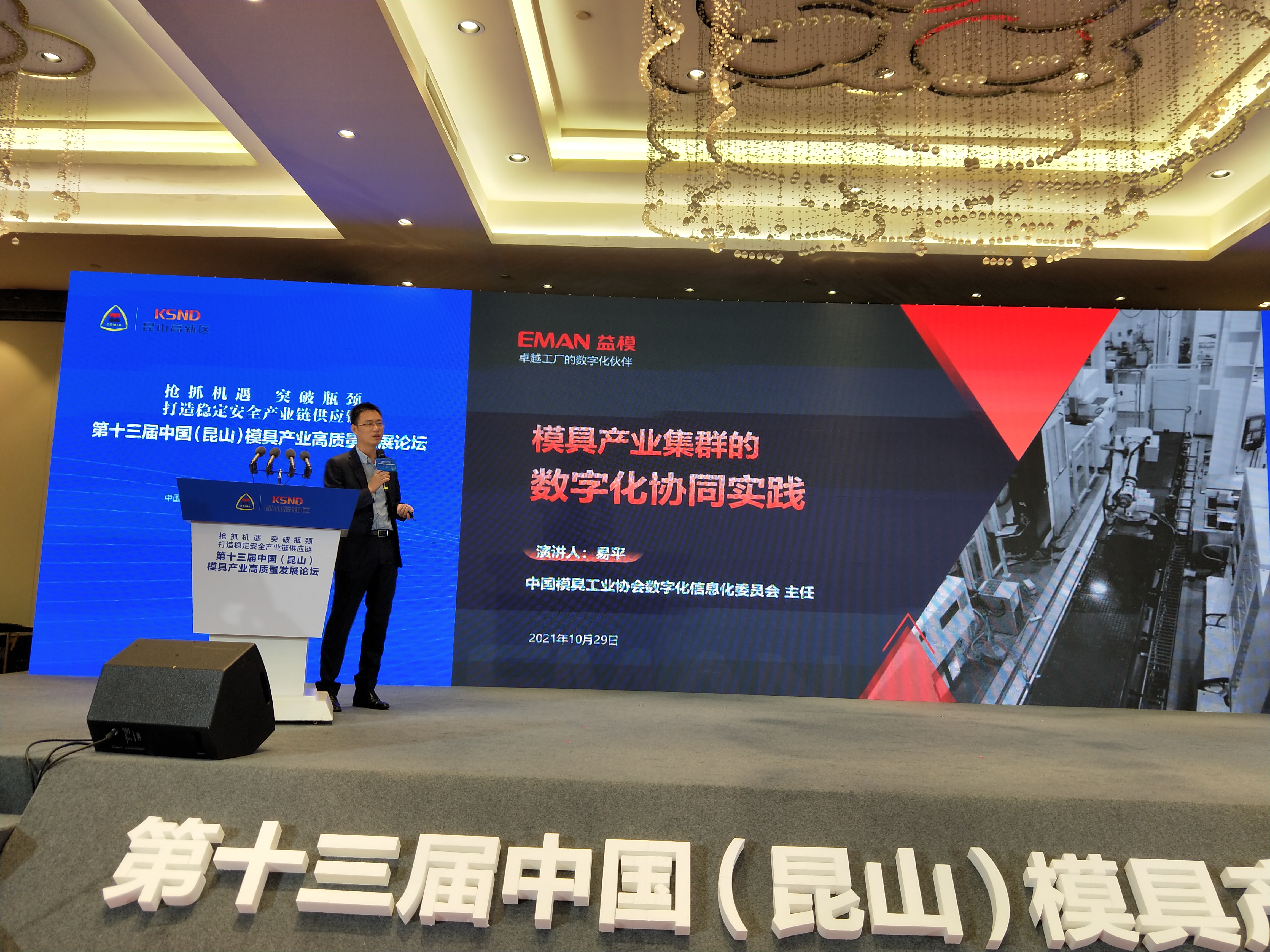 中國模具工業協會數字化信息化委員會主任、博士 易平 作《模具產業集群的數字化協同實踐》報告。