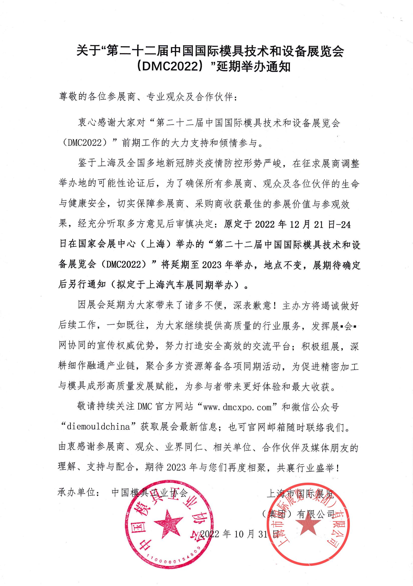 關(guān)于“第二十二屆中國國際模具技術(shù)和設(shè)備展覽會(huì)(DMC2022)”延期舉辦的通知