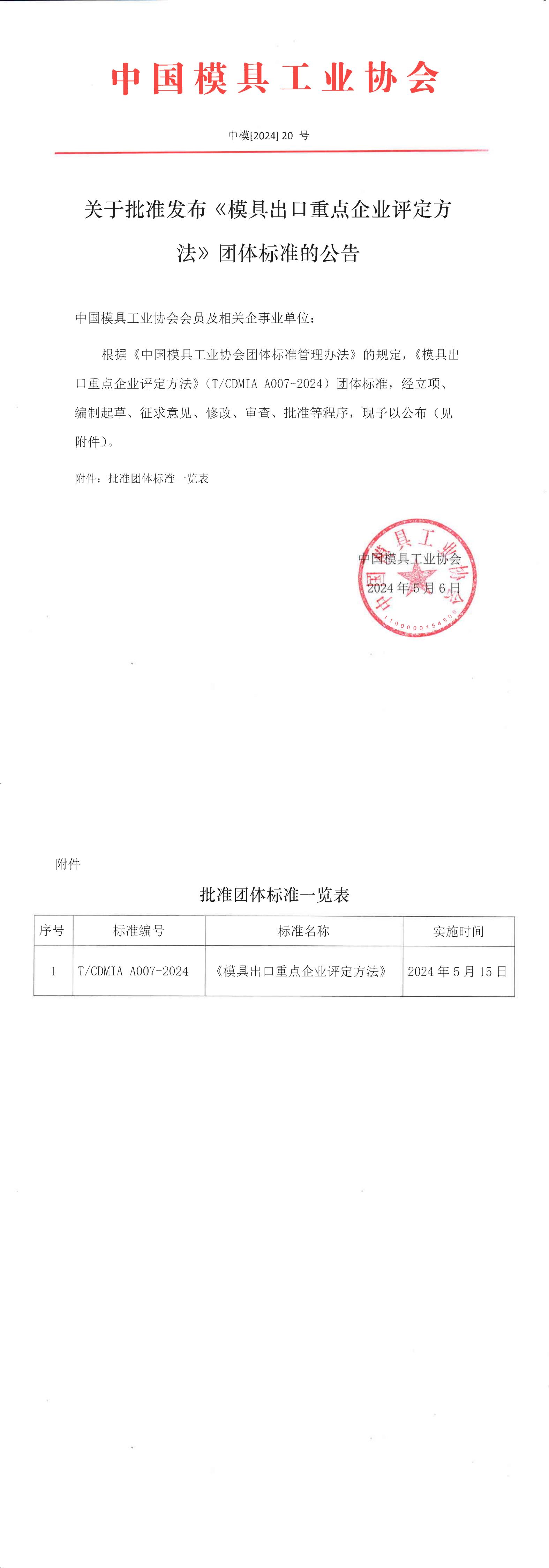 關(guān)于批準(zhǔn)發(fā)布《模具出口重點企業(yè)評定方法》團體標(biāo)準(zhǔn)的公告