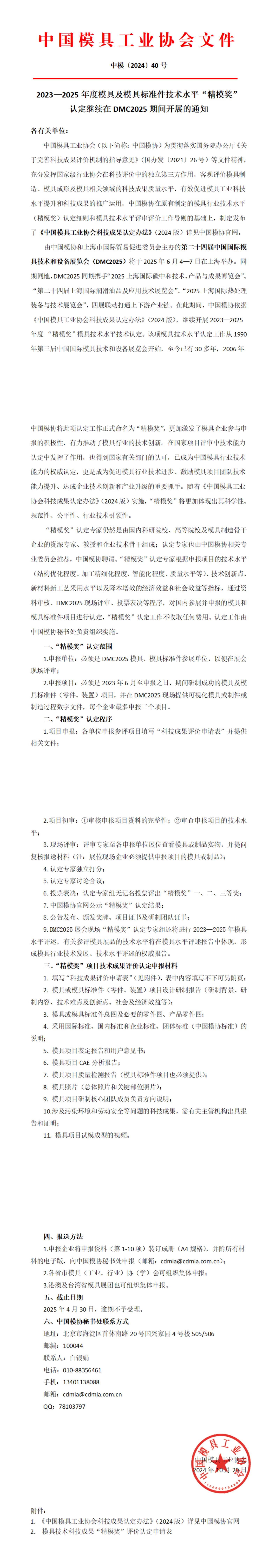 2023-2025年度模具及模具標準件技術水平“精模獎”認定繼續在DMC2025期間開展的通知