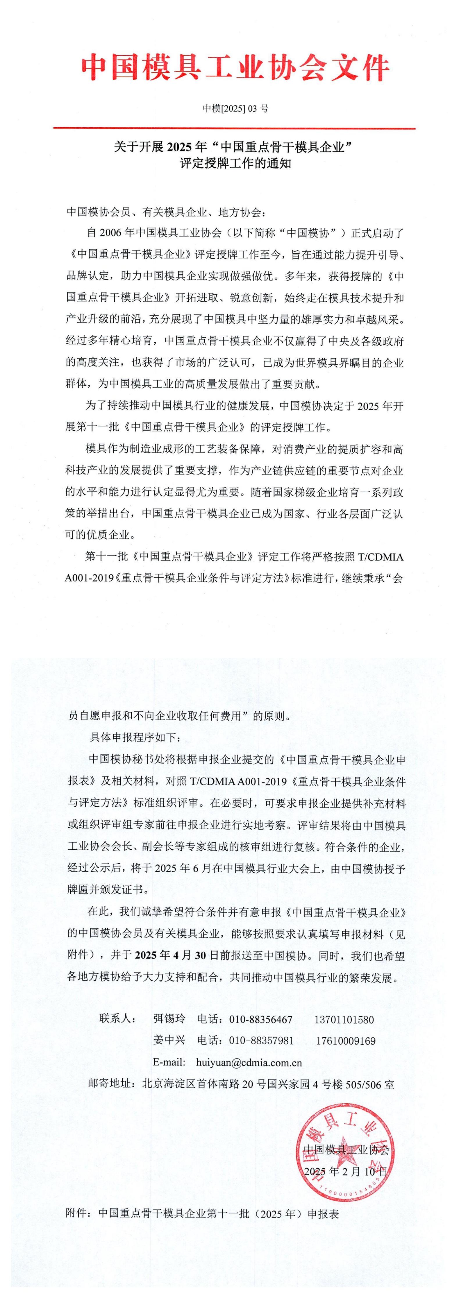 關于開展2025年“中國重點骨干模具企業”評定授牌工作的通知